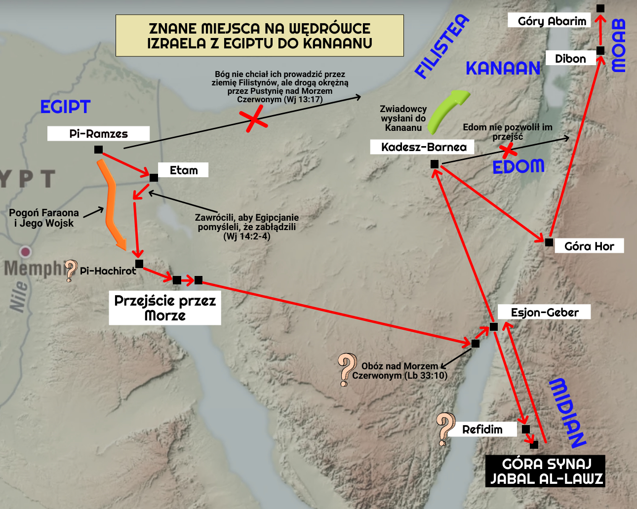Nasz szkic kierunków i przystanków wędrówki Izraelitów z Egiptu do Ziemi Obiecanej. Szkic nie zawiera bardzo wielu miejsc wskazanych w Biblii, których nie da się dzisiaj wskazać na mapie.